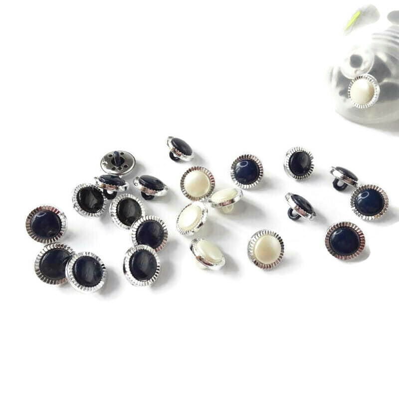 Guzik perłowy, w srebrnej metalowej obwódce, na stopce, do przyszycia .