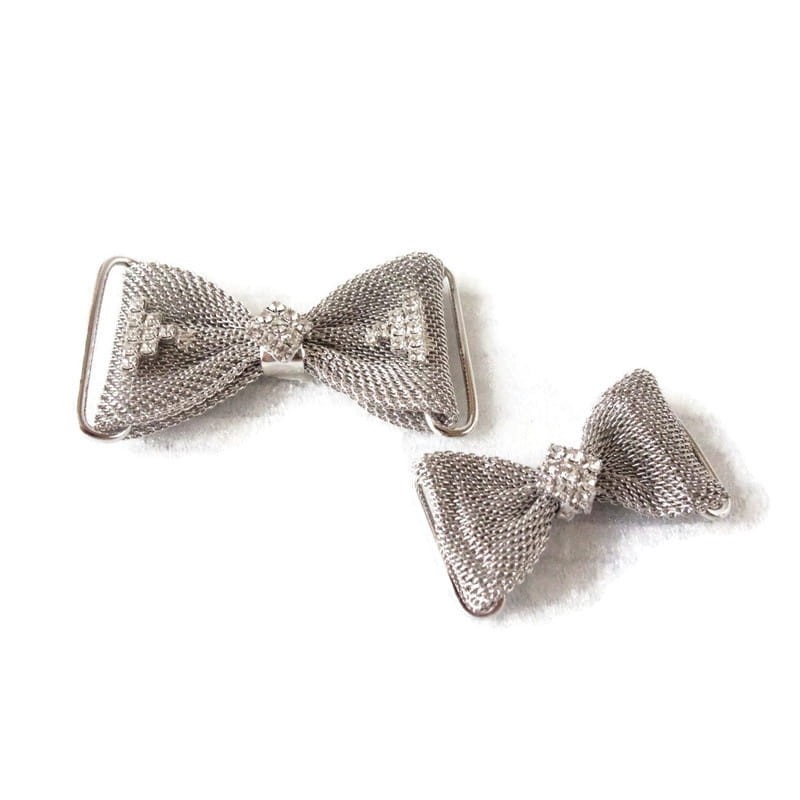 Metalowa, niklowana kokardka z metalowej siatki ozdobiona cyrkoniami.