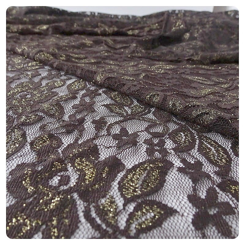 Tkanina koronka, delikatna, lekko elastyczna, ze złotą nitką,