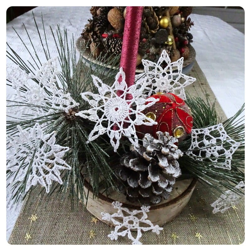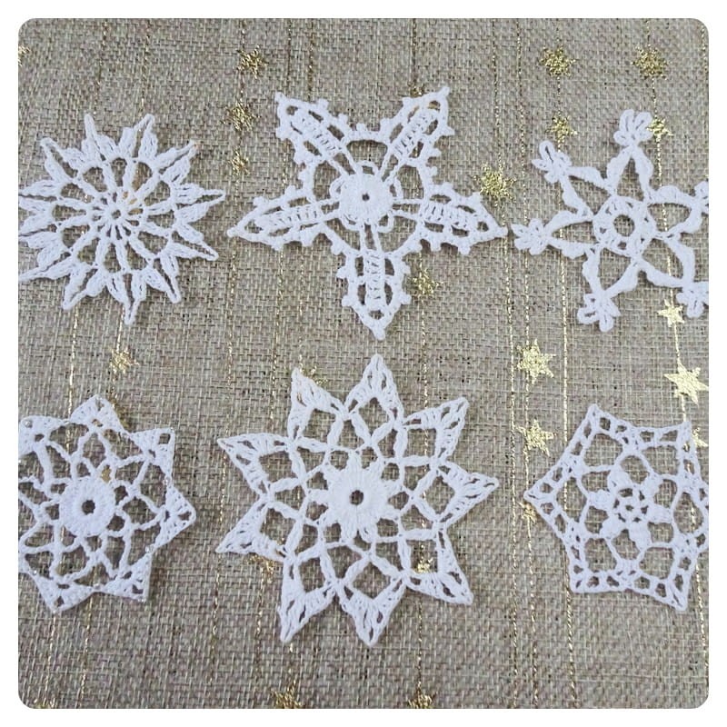 Szydełkowe śnieżynki wykonane z nici bawełnianych, usztywnione,