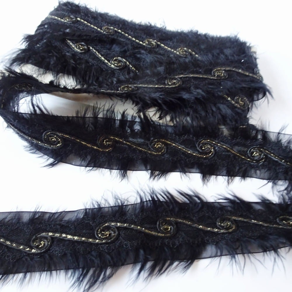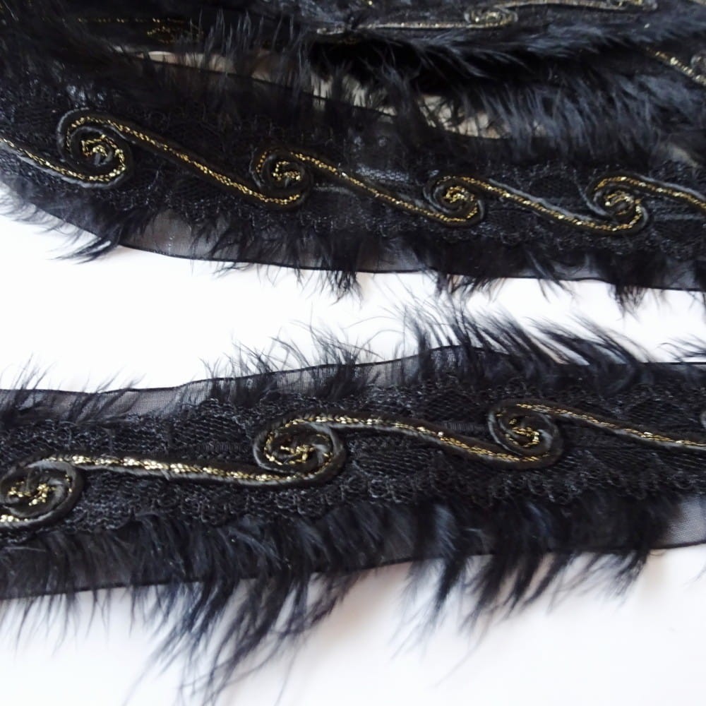 - taśma szyfonowa czarna, haft sutaszowy, delikatne piórka-futerko