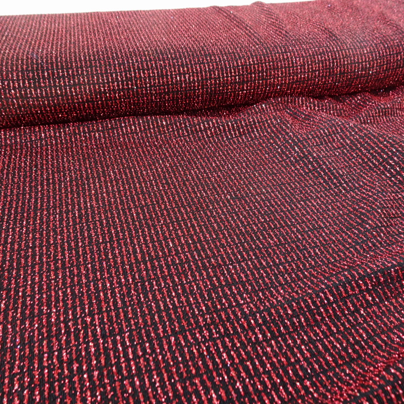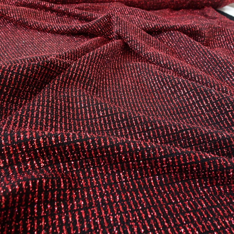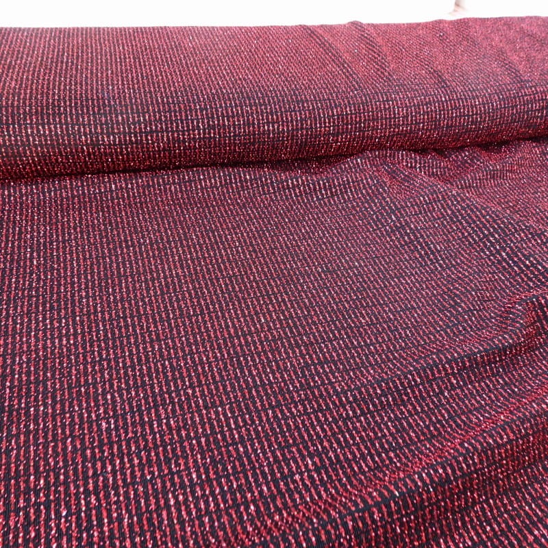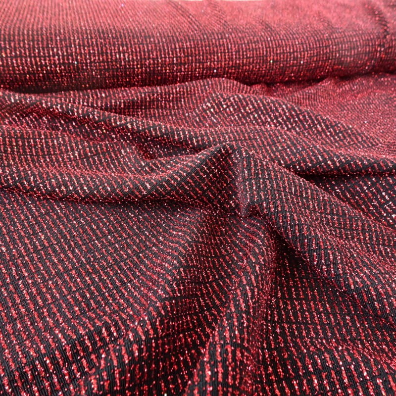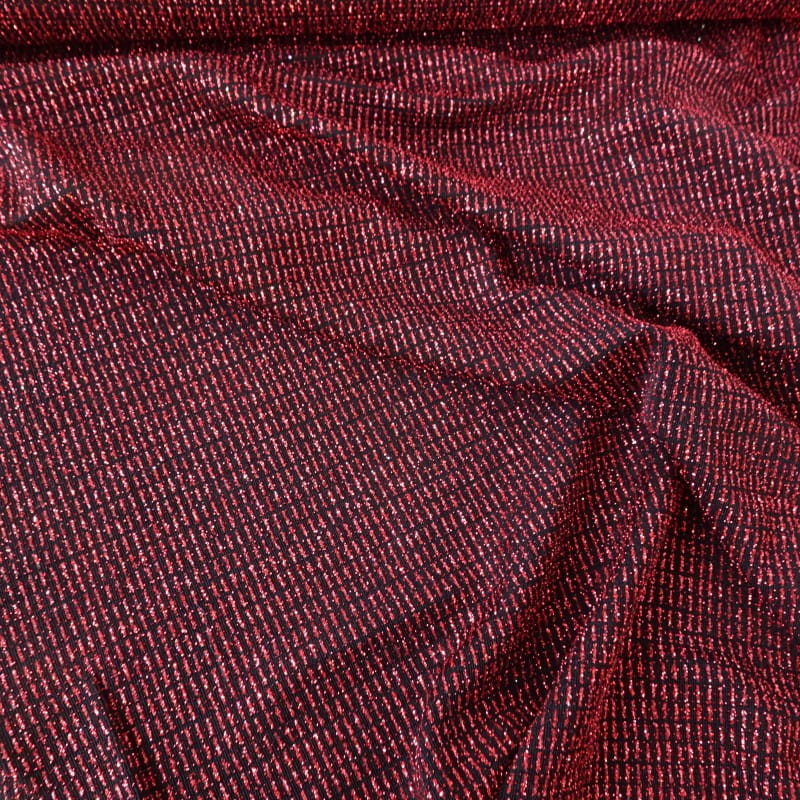 Tkanina dzianina elastyczna w kolorze bordowo-czarnym, lekko błyszcząca z brokatem, ciężka, lejąca